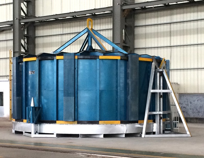 罩式加熱爐是一種用于金屬材料局部熱處理的罩式電加熱爐。包括底座、爐體、導風筒、風機,底座上有至少二根導向柱,導風筒沿導向柱安裝于底座上,爐體由爐身和爐蓋組成,爐身內壁裝有加熱器,爐體通過密封刀安裝于底座的密封槽內,風機固定于爐蓋上方,所述底座上開有至少一條通往底座外端的導向槽。其特點是:特別適用于長徑比較大、剛性差、而且要求在精加工后進行二次以上熱處理的金屬零件;無需搬動零件就可以實現空冷,可大大減輕工人的勞動強度;局部熱處理區域可調,可充分利用爐膛空間、節約能源。